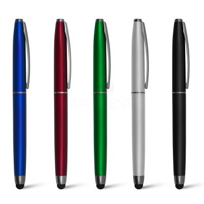 Caneta de plástico esferográfica com tampa e ponteira touch. Indicável agregar estojo de veludo. Cores disponíveis : preta, prata, azul, verde, grafite e vermelha