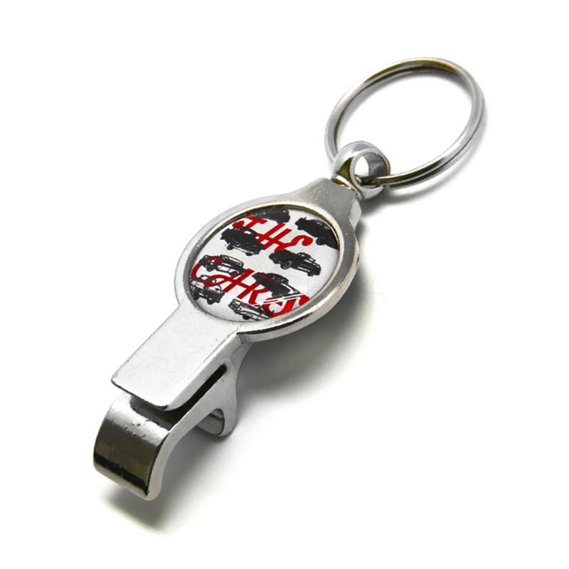 Chaveiro promocional com etiqueta resinado e abridor de garrafa.