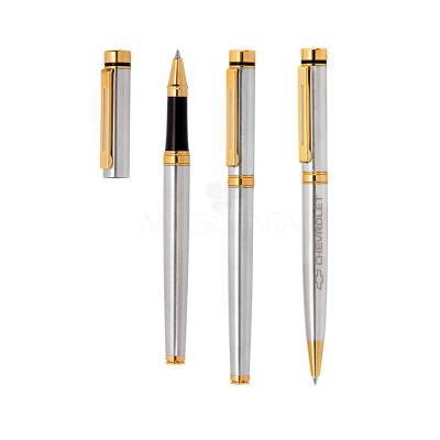 Conjunto Canetas de metal roller e outra estereográfica. Possui uma escrita macia e confortável. Ideal para brindes promocionais e eventos corporativos.