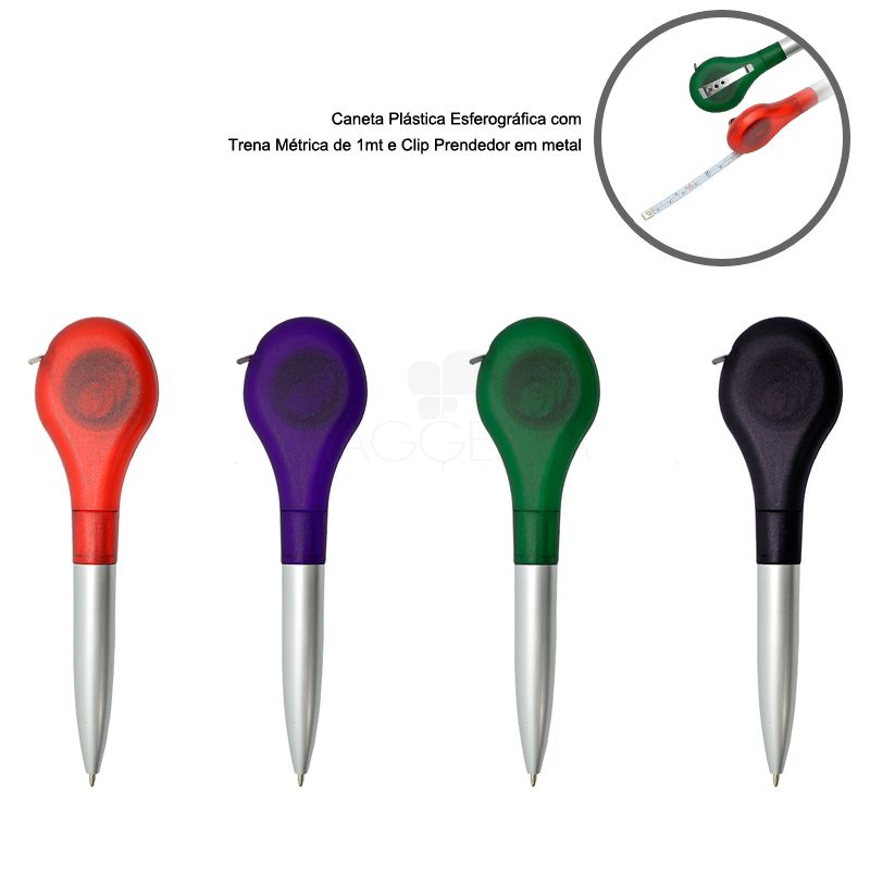 Brindes Caneta Plástica Esferográfica personalizada com trena métrica de 1mt ,clip prendedor em metal e acionamento giratório da ponta esferográfica. Consultar as cores. Gravação Silk