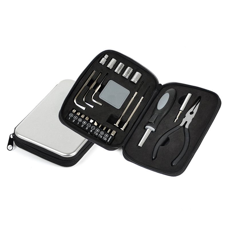 Conjunto de ferramentas promocional com 24 peças. Contém: Alicate de bico; Trena de 1m; 5 chaves Canhão: 6mm, 7mm, 8mm, 9mm e 10mm; 3 chaves Allen; Empunhadura fixa com prolongador e 9 tipos de chaves, sendo: 4 chaves Philips; 2 chaves Fenda; 3 chaves Torx; 2 chaves de precisão (relojoeiro), sendo uma Fenda e uma Philips. Completo e prático para uso doméstico e pequenos reparos.