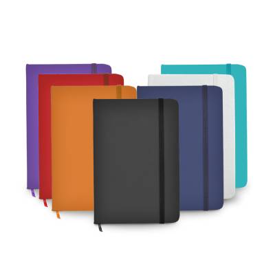 Bloco de Anotações capa dura revestida com material Soft Touch, possui aproximadamente 80 folhas pautadas amareladas, separador de páginas e elástico de fechamento.