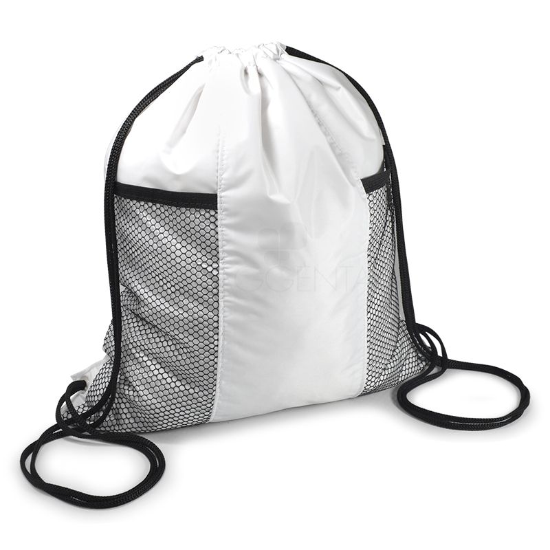Mochila saco para brindes personalizados. Confeccionada em nylon 70, com alça em cordão e rede frontal para armazenar objetos.