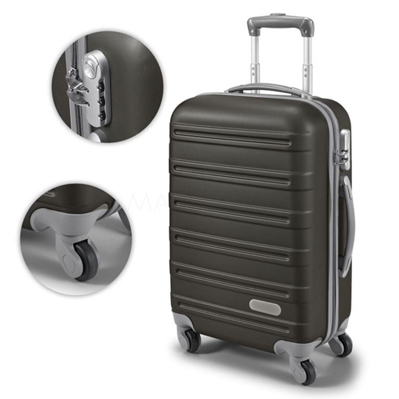 Produzida em ABS, possui 4 rodas giratórias, pega extensível em alumínio com mola ( altura da pega estendida: 43,5 cm ) Fecho de segurança com senha e interior com divisórias. Chapa de Metal 6 x 1,5 cm.