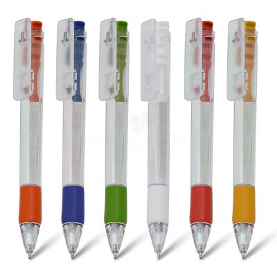 Possui acionamento por click, corpo translúcido, ponteira esferográfica com carga azul e clip resistente.