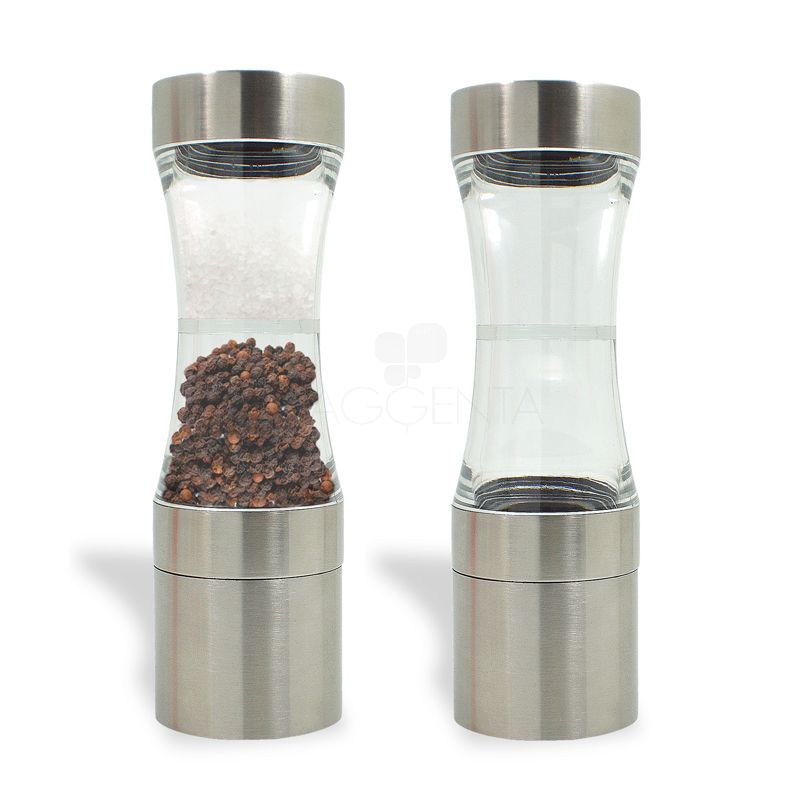 com base e tampa em metal, reservatórios independentes em ABS rígido, um recipiente para moer e ou outro para usar seus condimentos prediletos. Possui triturador interno ajustável na base do produto.
