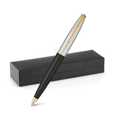 Com estojo personalizado com um toque elegante e luxuoso por conter detalhes na caneta na cor dourado. Acionamento da ponteira é através do sistema giratório.
