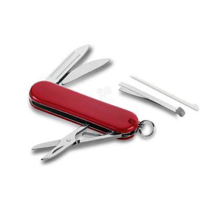Produzido em ABS e metal personalizado possui 5 funções sendo elas: 1 faca, 1 tesoura,1 lixa, 1 pinça e 1 argola.