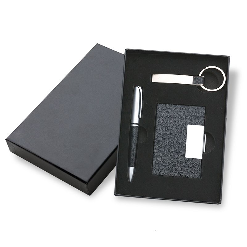 Possui embalagem em estojo de papelão com tampa e parte interna revestida de espuma. Contém: chaveiro metal fosco com detalhe emborrachado preto, porta cartão de couro sintético(verso metálico liso) com placa de metal e caneta metal fosca com detalhe emborrachado preto.
