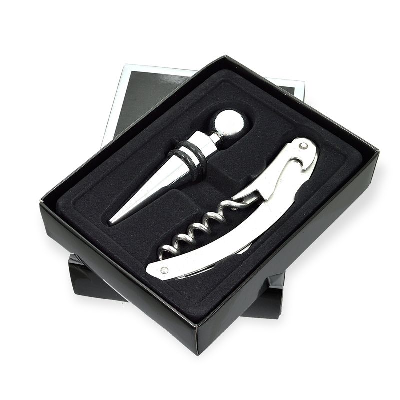 Conjunto para vinho. Saca-rolhas com canivete de escanção e rolha. Possui embalagem com acabamento aveludado.
