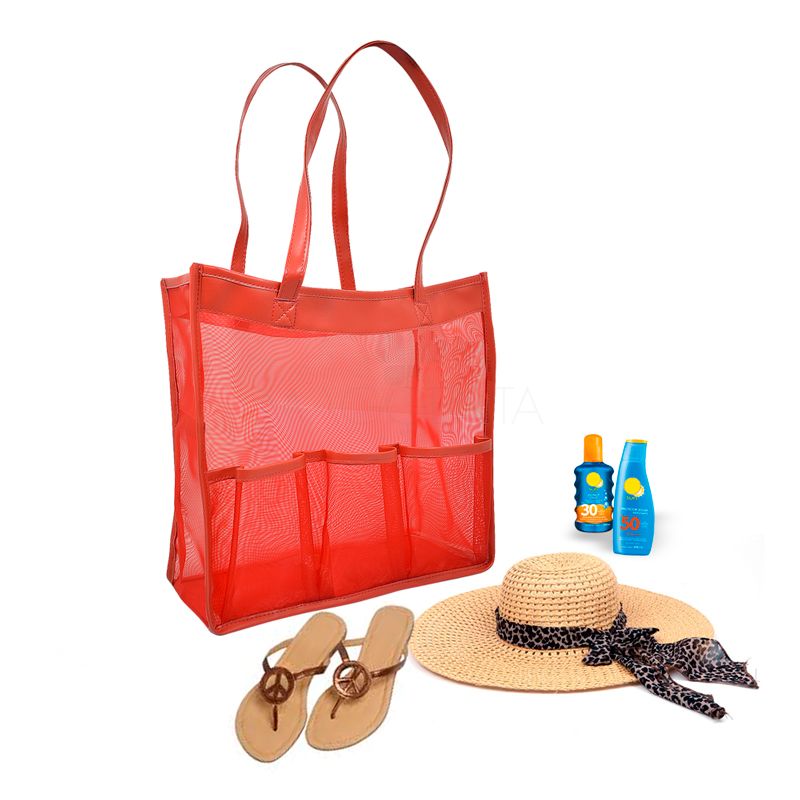 Sacola de praia personalizada com alça e acabamentos em couro sintético, bolsos frontais, tela em nylon resistente e um excelente espaço interno.