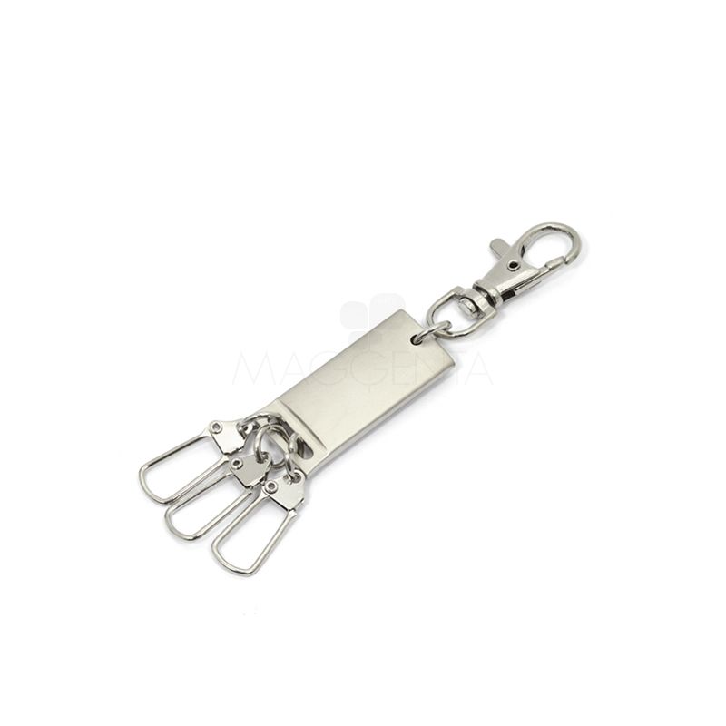 Produzido em metal possui acabamento fosco personalizado. Contém mosquetão de engate rápido e 3 mosquetes para chaves.