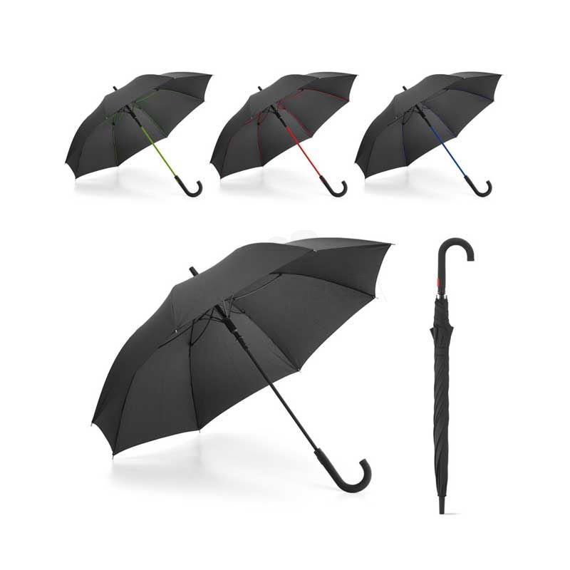 Produzido em poliéster 190T com haste em fibra de vidro e cabo curvado revestido a borracha, possui abertura automática. À prova de vento. *Abertura total ø1040 mm.