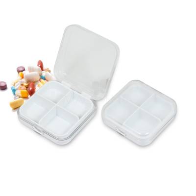 Porta comprimido personalizado com tampa articulada e 4 compartimentos para colocar comprimidos ou cápsulas. Ideal para brindes promocionais e eventos corporativos.