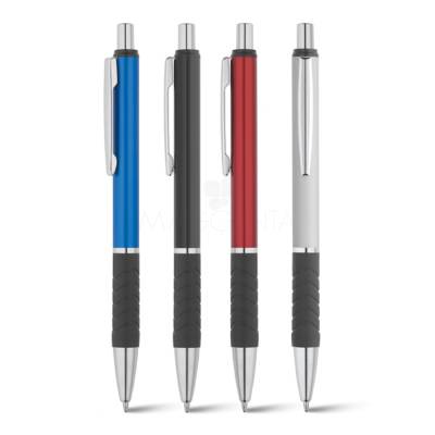 Caneta de metal personalizada com detalhes emborrachados que asseguram a escrita obtendo conforto e precisão. Possui escrita esferográfica na cor azul que é exibida e recolhida através do mecanismo do click, com clip de metal personalizado.