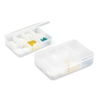 Porta comprimidos personalizado com tampa protetora e 7 divisórias. Ideal para brindes promocionais e ventos corporativos.