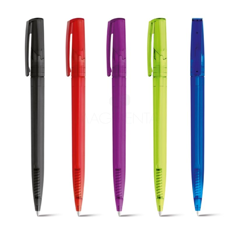 Caneta plástica personalizada com design inovador possui clip personalizado e detalhe emborrachado facilitando uma escrita macia e confortável.