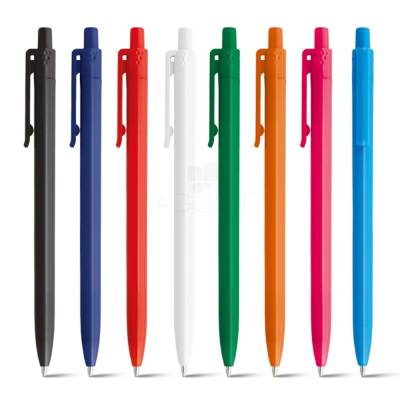 Caneta plástica produzida em ABS, esferográfica na cor azul que é exibida e recolhida através do mecanismo do click.
