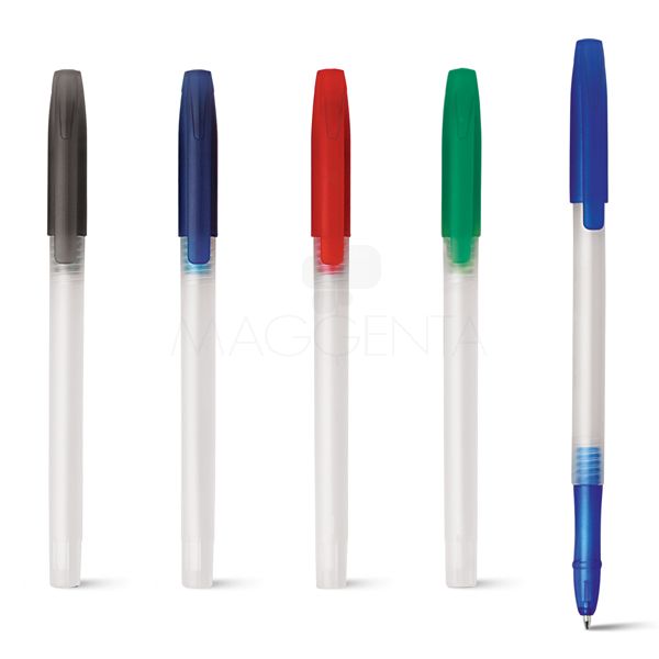Caneta plástica produzida em ABS translúcido, esferográfica na cor preta com tampa e clip plástico personalizado.