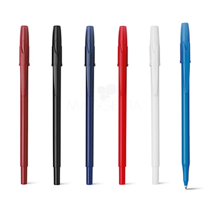 Caneta plástica produzida com acabamento brilhante, possui esferográfica na cor azul com tampa e clip personalizado.
