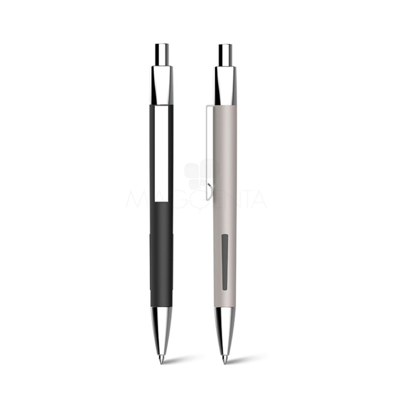 Caneta de metal personalizada com acabamento fosco, detalhe emborrachado na parte inferior da caneta, esferográfica na cor azul, clip de metal e acionamento da escrita por click.
