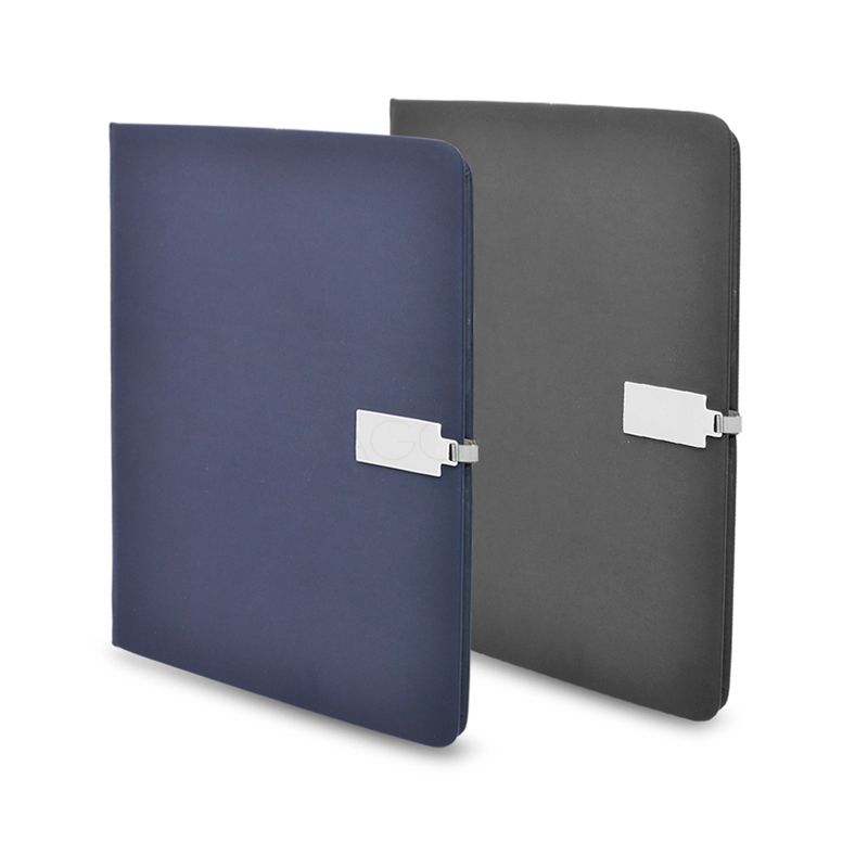 Bloco de anotações capa dura com acabamento emborrachado, detalhe imantado de metal para fechamento, marcador de página em cetim e com 96 folhas internas pautadas.