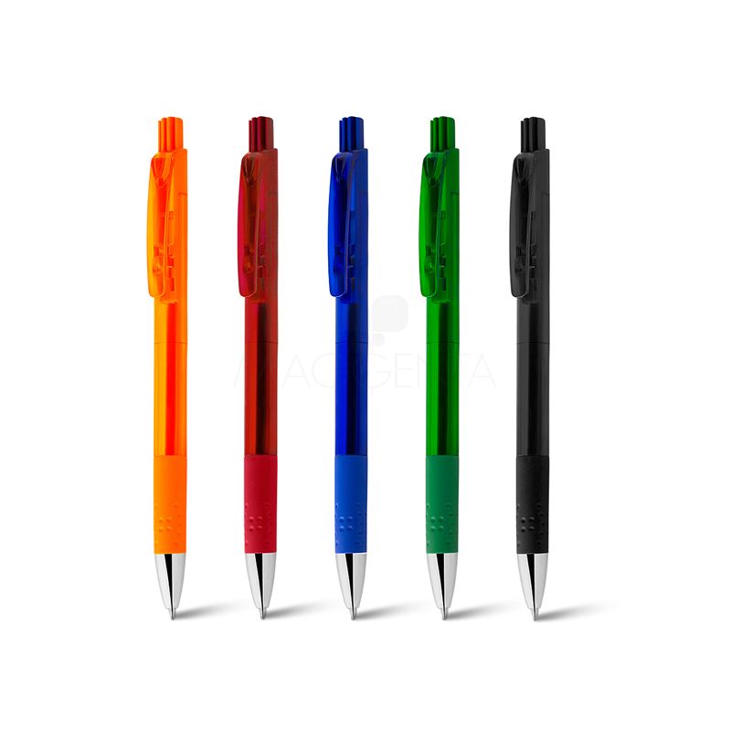 Caneta plástica personalizada possui clip injetado e acionamento da ponteira na parte superior da caneta.