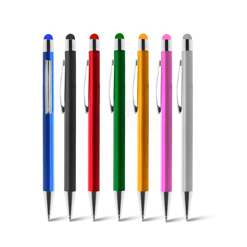 Caneta de metal personalizada com acionamento da escrita por click, possui ponteira touch para uso em Tablets e Smartphone e detalhes todos em metal.