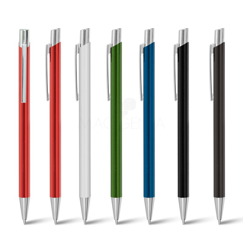 Caneta de metal personalizada com esferográfica na cor azul e clip de metal. Possui um design elegante e inovador ideal para eventos corporativos, campanhas publicitárias e brindes promocionais.