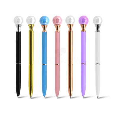 Caneta de metal personalizada com detalhe similar a uma pérola na parte superior da caneta. Possui um anel no corpo e escrita na cor azul acionada através do sistema giratório.
