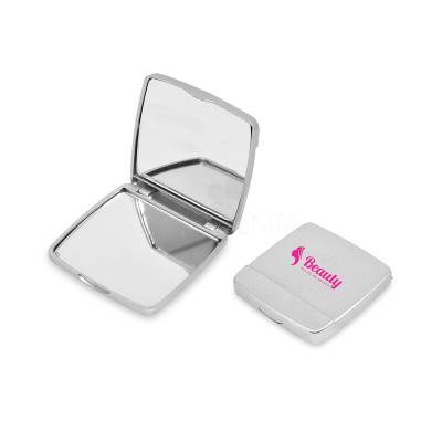Espelho de bolsa personalizado com tampa protetora plástica. Possui uma fase normal e outra com zoom para facilitar a maquiagem. Ideal para brindes personalizados, dias das mães e eventos corporativos.