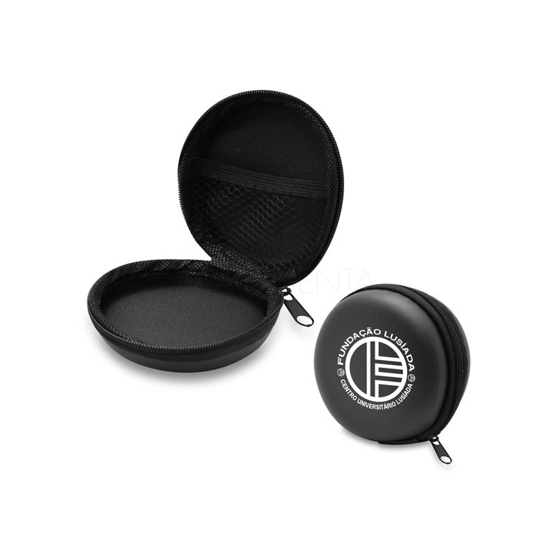 Estojo redondo personalizado produzido em material emborrachado fosco. Possui parte interna com rede de nylon e ziper para fechamento. Ideal para brindes personalizados e eventos corporativos.