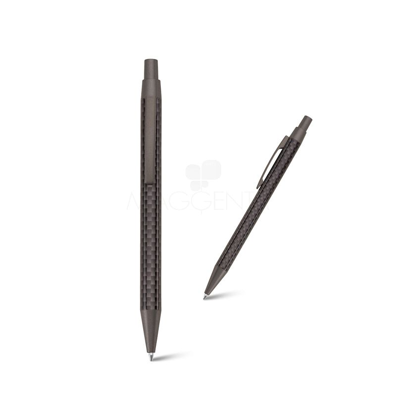 Caneta de metal personalizada com textura quadriculada em todo corpo da caneta, possui acionamento por click e escrita na cor azul. Ideal para brindes personalizados e eventos corporativos.