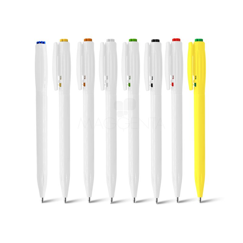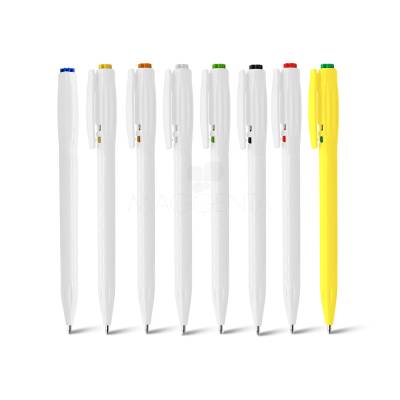 Caneta plástica personalizada com detalhe em relevo na parte superior ao redor do clip. Possui escrita na cor azul, acionamento por clique e para destravar basta apertar a parte inferior do clip. Ideal para divulgar sua empresa em eventos corporativos, brindes personalizados e campanhas promocionais.