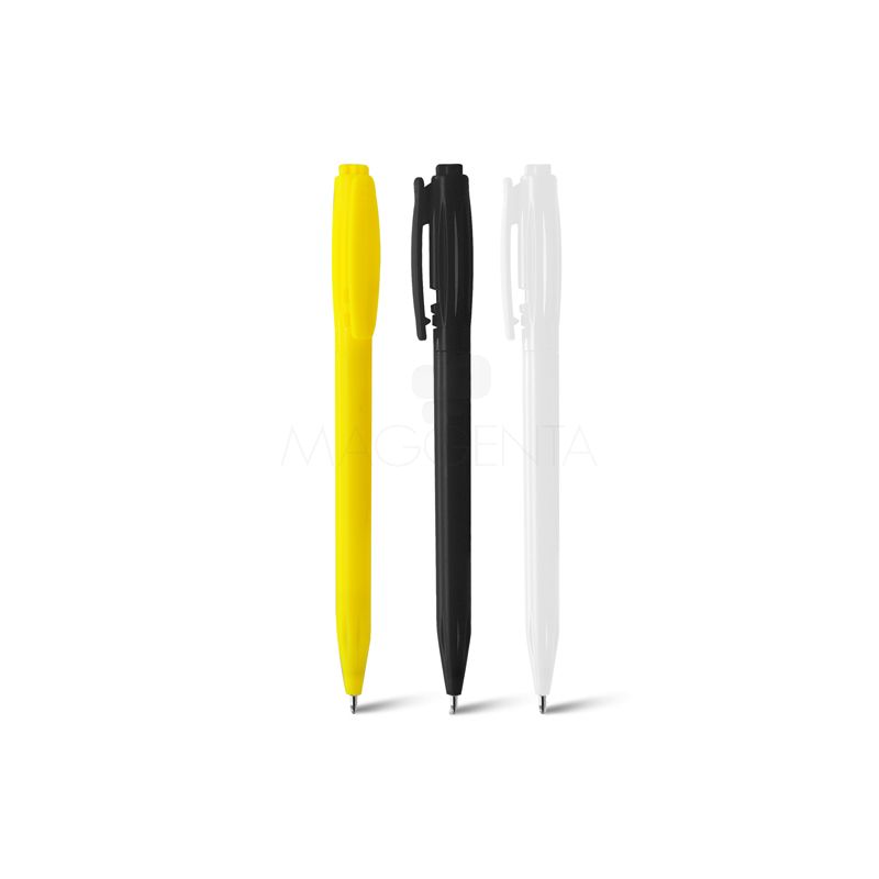 Caneta plástica personalizada com detalhe em relevo na parte superior ao redor do clip. Possui escrita na cor azul, acionamento por clique e para destravar basta apertar a parte inferior do clip. Ideal para divulgar sua empresa em eventos corporativos, brindes personalizados e campanhas promocionais.