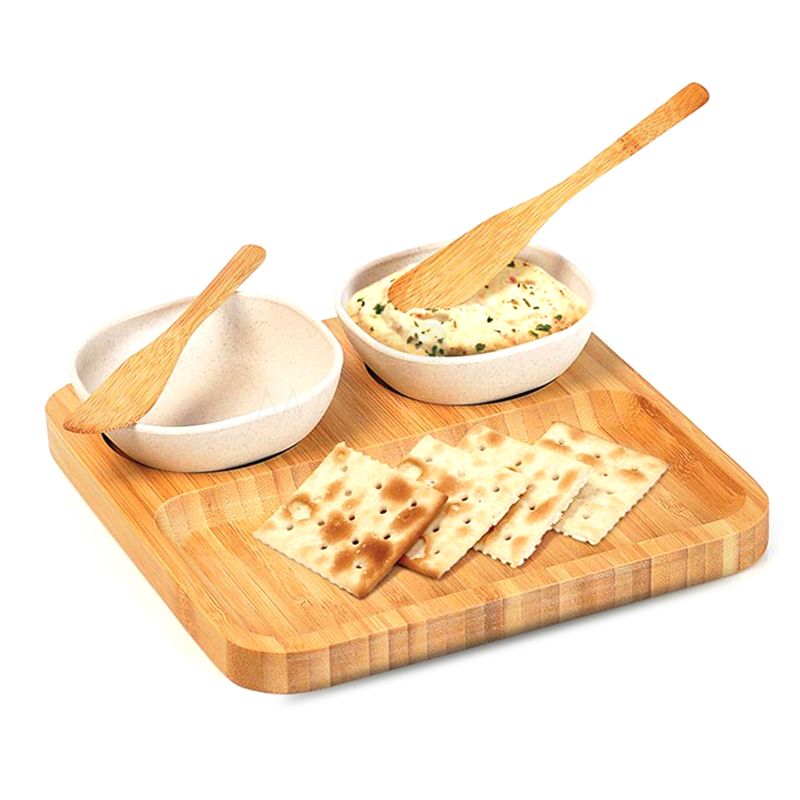 Conjunto para petiscos e patês em Bambu/Fibra de Bambu. Acompanha dois potes em Fibra de Bambu, base e duas espátulas 14cm em Bambu. Produtos confeccionados em Bambu: Utilizamos o Bambu, por ser uma matéria prima ecológica, autossustentável e com alta resistência. Além de versátil, o Bambu é 30% mais leve que as madeiras de lei. Ideal para divulgar sua empresa em eventos corporativos, brindes personalizados e campanhas promocionais.