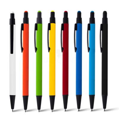 Caneta de metal personalizada com textura fosca no corpo e acionamento da escrita por click, possui ponteira touch para uso em tablets e smartphone. Ideal para brindes promocionais e eventos corporativos.