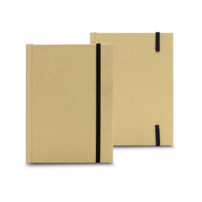 Bloco para anotações personalizado com capa dura em papel Kraft, contem aproximadamente 100 folhas não pautadas na cor bege. Possui fecho de elástico e marca texto de nylon. Ideal para brindes promocionais e distribuição em feiras e eventos corporativos.
