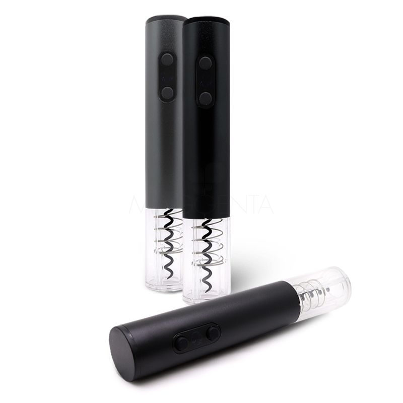 Saca-rolha automático personalizado produzido em inox com acabamento colorido fosco e detalhes em plástico PP. Possui um sistema que remove a rolha da garrafa com apenas um toque. Um botão perfura a rolha da garrafa e o outro extrai, puxando automaticamente a rolha da garrafa. Suporte de mesa removível que serve também como cortador de lacre, luz indicadora de LED e funcionamento do saca-rolha a base de 4 pilhas AA (não inclusas no produto). Ideal para brindes promocionais e eventos corporativos. Obs: Bebida não acompanha o produto.