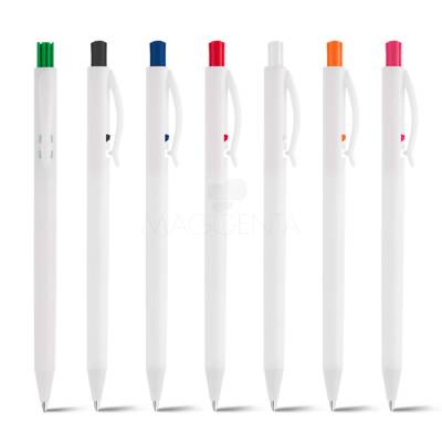 Caneta plástica personalizada com detalhe colorido, possui clip injetado e acionamento da ponteira na parte superior da caneta. Ideal para brindes promocionais e eventos corporativos.
