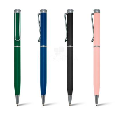 Caneta de metal personalizada com detalhes em metal, possui acionamento por giro, clip curvado de metal e esferográfica na cor azul. Ideal para brindes promocionais e eventos corporativos.