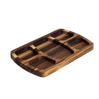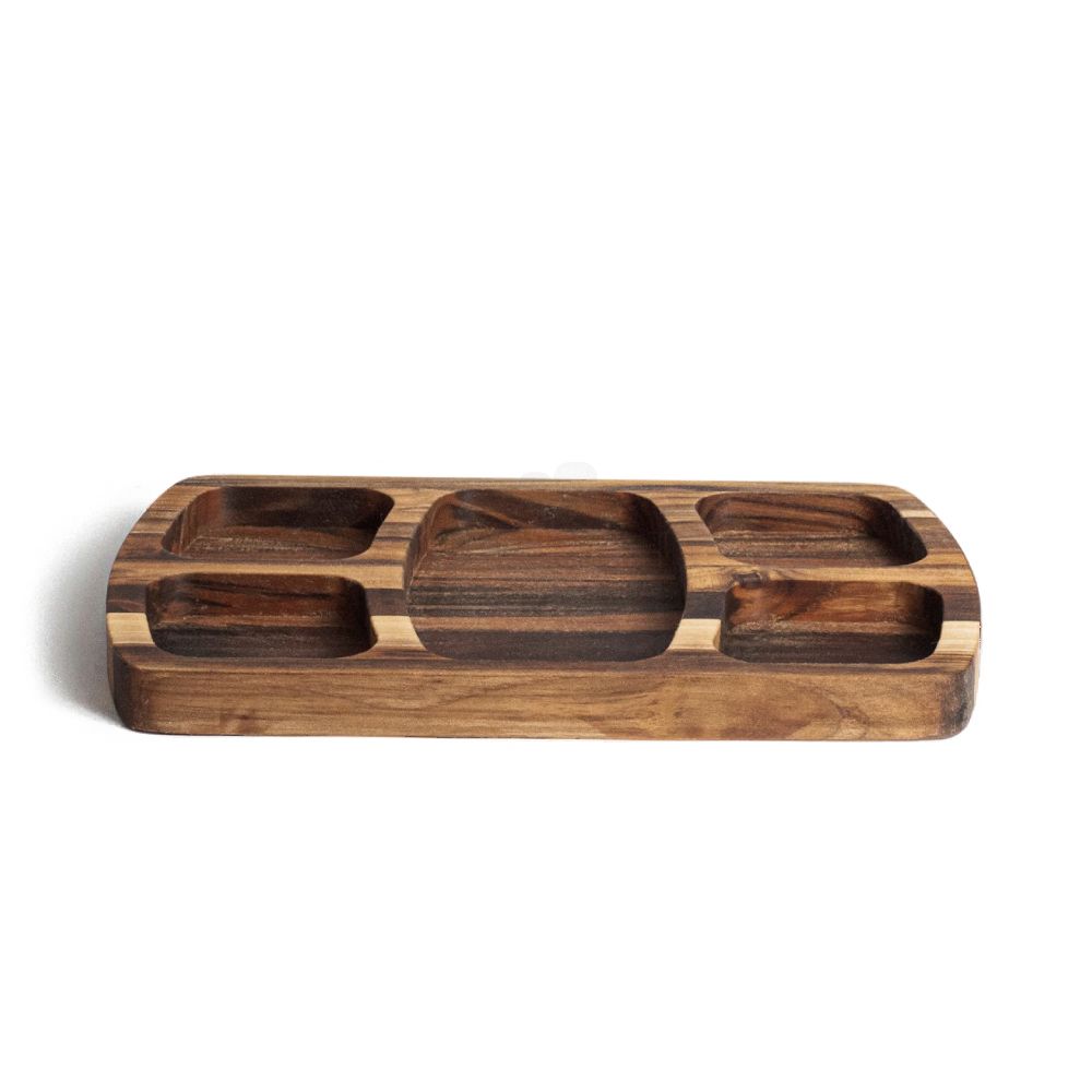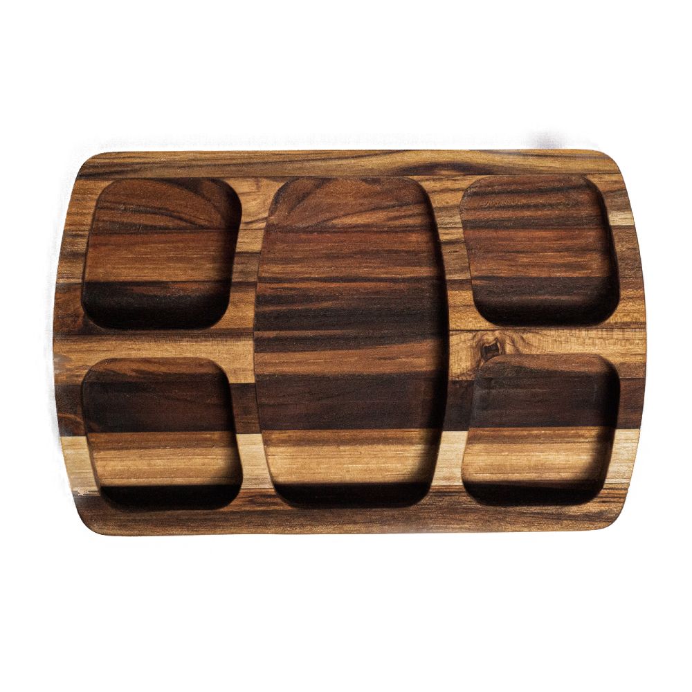 Petisqueira de Madeira com cinco compartimentos . Design moderno e elegante perfeito para trabalhos culinários de alto padrão. Ideal para brindes em campanhas promocionais, eventos corporativos e feiras gastronômicas.