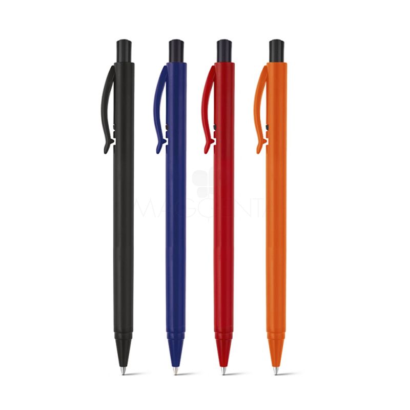 Caneta plástica personalizada produzida em ABS com acabamento brilhante. Possui clip injeta, esferográfica cor azul e acionamento da escrita por click.