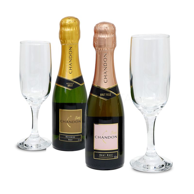 Kit bebida espumante personalizado com 1 Chandon Baby Réserve Brut 187 ml, 1 Chandon Baby Rosé 187 ml, 2 taças de vidro com capacidade para 180 ml cada e embalagem personalizada em papel paraná 80gr revestido de papel color plus. É o presente ideal para presentear colaboradores, fornecedores e clientes em momentos memoráveis.