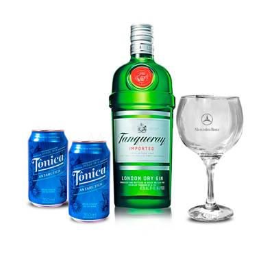 Kit personalizado com 1 Garrafa GIN TANQUERAY TEN de 750ml, 2 latas de Água tônica de 350ml cada, 1 taças GIN de vidro 600ml, boca mais aberta e bojo largo e embalagem em papel paraná 80gr revestido de papel color plus. Visual elegante e conteporâneo, É o presente ideal para presentear colaborador, fornecedores e clientes em momentos memoráveis.