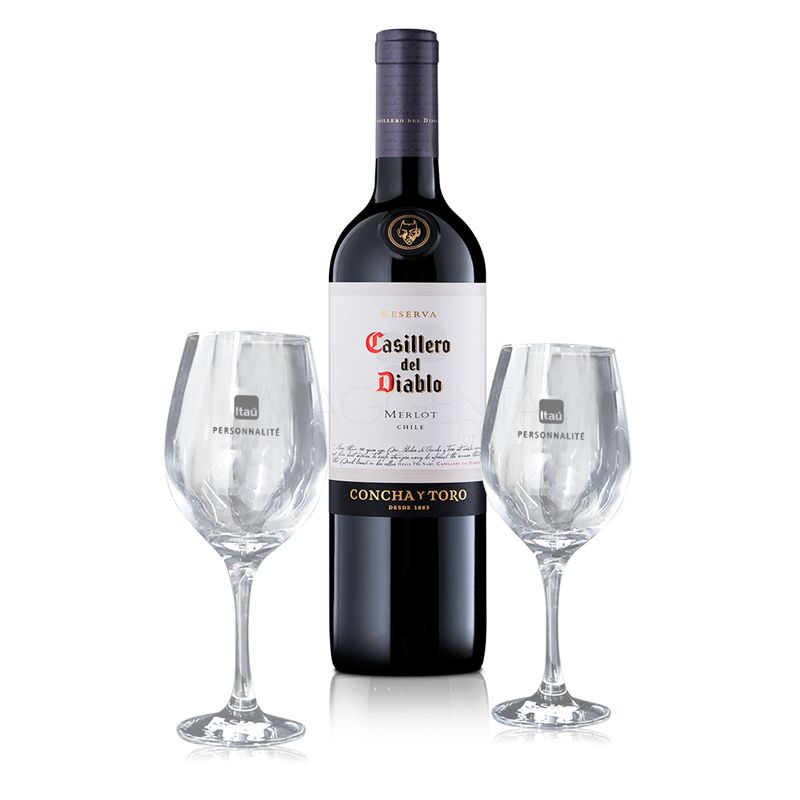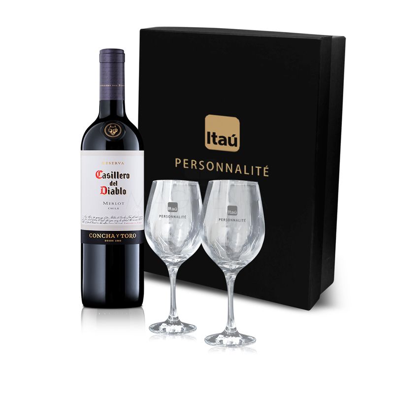 Kit Vinho personalizado com 1 Garrafa de vinho Casillero del Diablo de 750ml, 2 taças de Vidro de 490ml com bojo grande, haste longa, boca fechada para melhor concentração do aroma e embalagem em papel paraná 80gr revestido de papel color plus. Visual elegante e conteporâneo, É o presente ideal para presentear colaborador, fornecedores e clientes em momentos memoráveis.