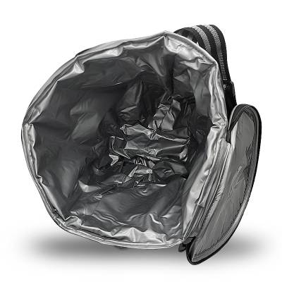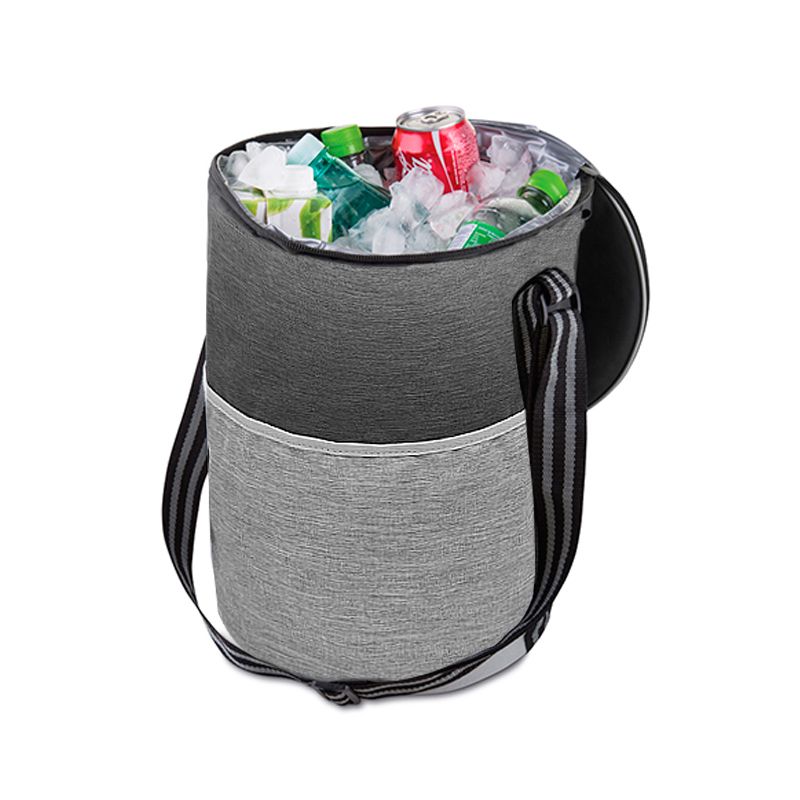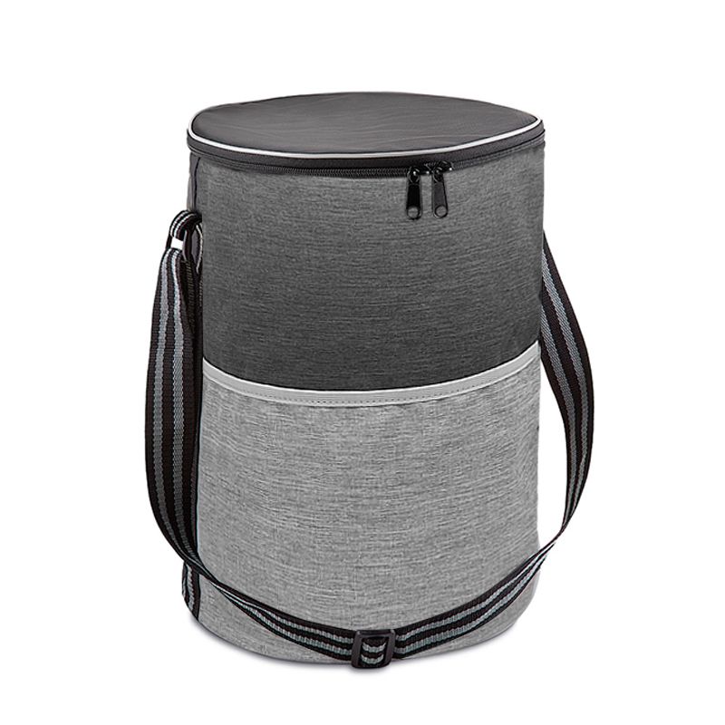 Bolsa térmica com capacidade para 25 litros. Produzida em tecido nylon e polyester na cor preta e cinza diferenciado, possui bolso frontal, alça de ombro regulável (50cm), parte interna soldada com material térmico que conserva a temperatura e retém líquidos e tampa superior com fechamento por zíper duplo. Ideal para brindes promocionais e eventos corporativos. Imagem ilustrativa.