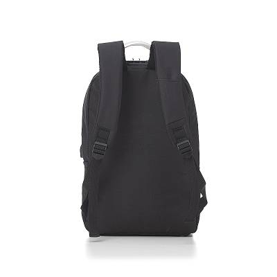 Mochila para notebook personalizada produzida em poliéster. Possui compartimento interno para notebook de 14.5 Polegadas, cursores de metal, fechamento por cadeado com senha, alça de mão em metal, alça de ombro acolchoada, 2 bolsos frontais, 2 bolsos laterais, mini bolso na alça de ombro, conector USB na lateral e saída para fones de ouvido na lateral. Ideal para brindes promocionais e eventos corporativos.