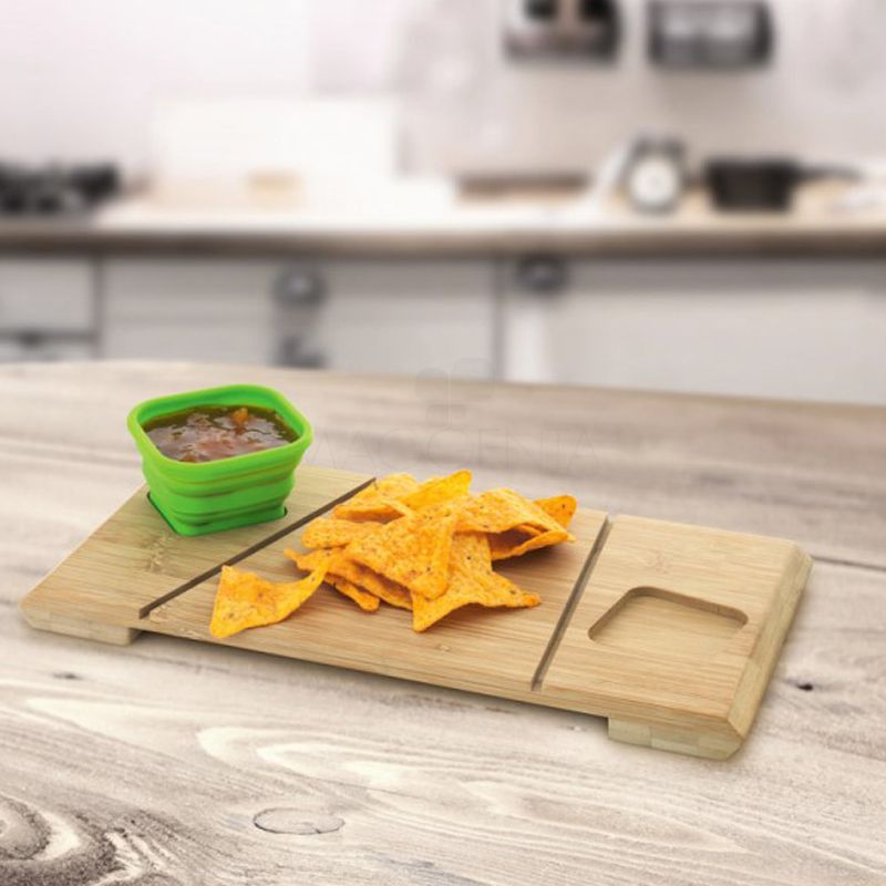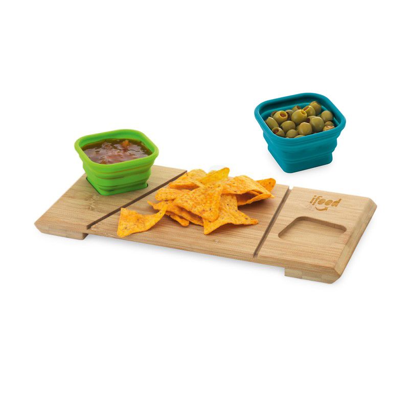 Possui 2 potes retráteis em silicone, 1 tábua em bambu tratado com detalhes diferenciados e base inferior em bambu. Ideal para petiscos em geral. * Imagem ilustrativa.