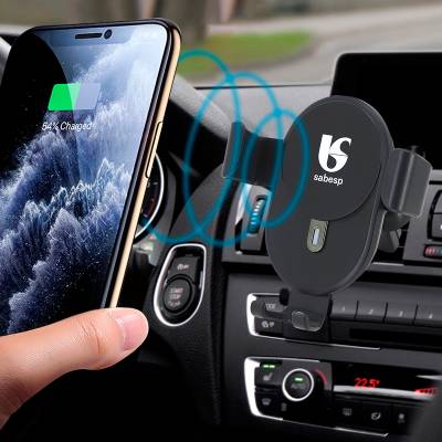 Suporte veicular wireless para carregamento por indução personalizado. Possui abertura ajustável das hastes laterais proporcionando um melhor ajuste ao smahrtphone, entrada inferior Micro USB, Led frontal com indicador, base e hastes com acabamento emborrachado antideslizante, suporte traseiro com fixador regulável em rotação 360º, cabo USB para carregamento / micro USB, entrada: DC5V- DC9V-2A, saída: D10W - 7.5W - 5W - 20W - 15W, hastes com travas automáticas quando ajustadas no smartphone, distância do carregamento sem fio: 0,5 à 8mm. Compatível somente com aparelhos que possuam o modo ''Qi'' de carregamento por indução. Ideal para divulgar sua empresa em eventos corporativos, brindes personalizados e campanhas promocionais. *Imagem ilustrativa